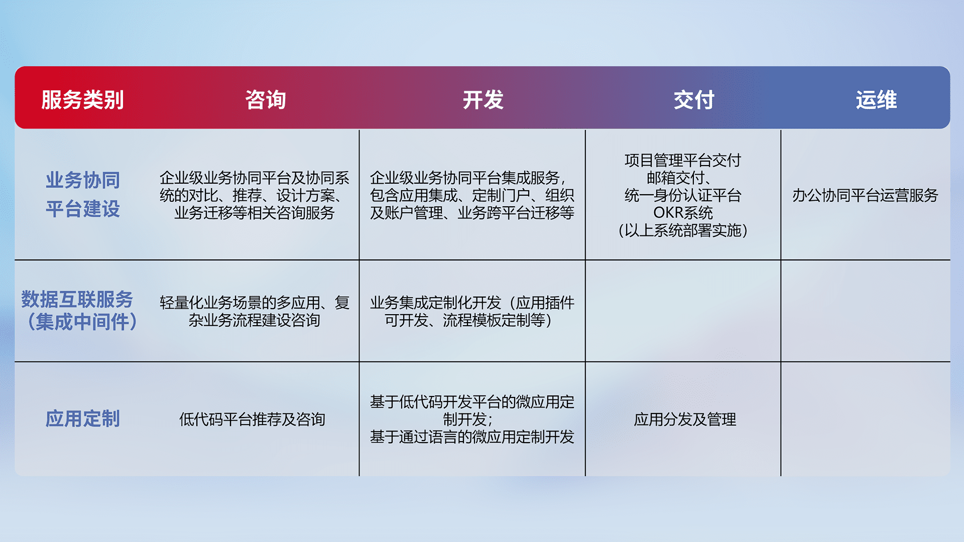 针对钉钉、、企微、、IDaas等平台级产品提供产品的规划、、、、方案、、交付、、、、定制化开发等服务,,实现如统一协同办公、、、智能客户服务、、、、混合会议管理、、智能数据查询、、等业务场景,,实现数字化转型。。。