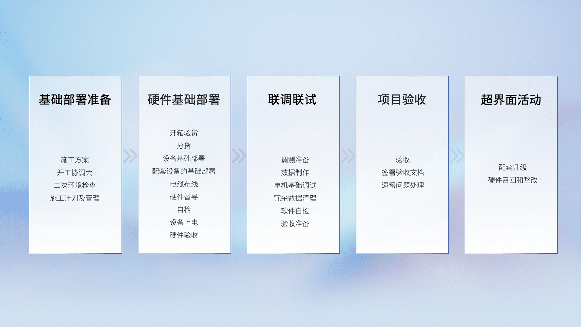 从基础部署准备、、、、硬件基础部署、、联调联试、、项目验收、、、越界面活动的全过程可追溯,,保证施工质量和进度。。